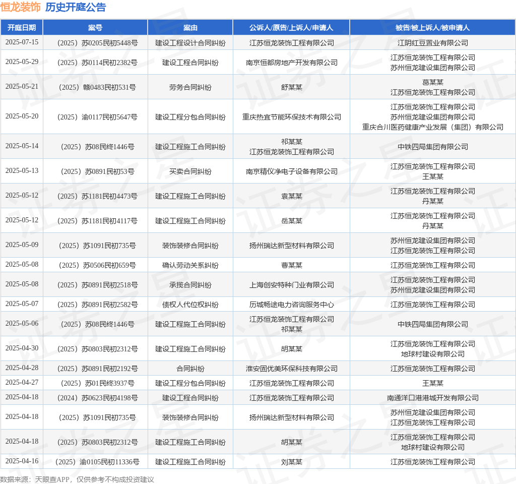 本站消息,根据天眼查APP显示,近日公布了一则江苏恒龙装饰工程有限公司作为被告/被上诉人的开庭公告,详细内容如下: